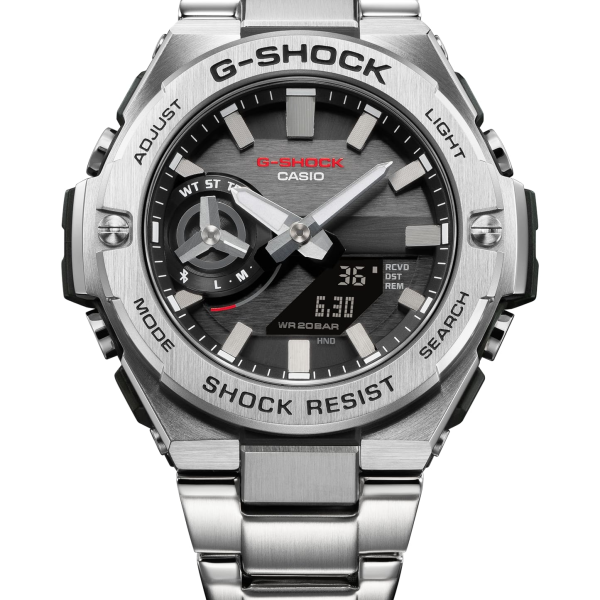 اگر دنبال ساعتی هستید که هم ظاهر شیک و مدرن داشته باشد و هم در برابر ضربه و شرایط سخت مقاومت کند، ساعت کاسیو جیشاک GST-B500D-1A دقیقاً همان چیزی است که لازم دارید. این مدل از سری G-STEEL با قاب و بدنه استیل ضدزنگ نقرهای و صفحه مشکی با جزئیات نقرهای و سفید، ترکیبی از ظرافت و دوام را ارائه میدهد.