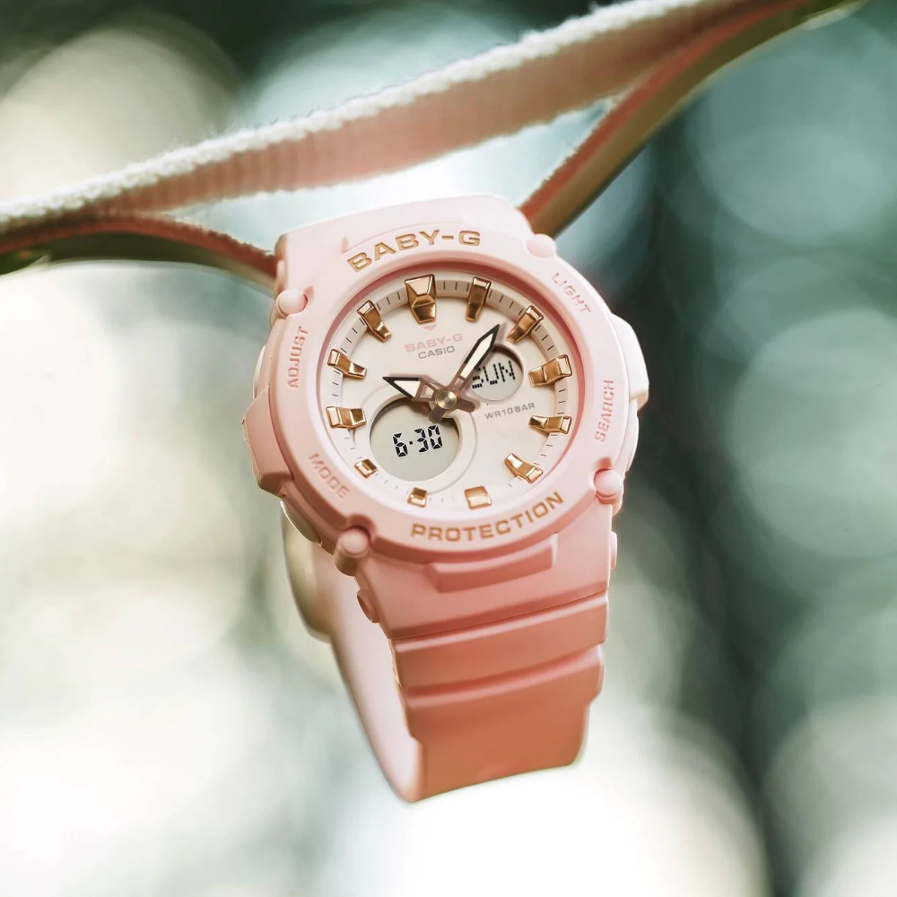 ظاهر ساعت BGA-275-4A با ترکیب رنگهای صورتی ملایم، طلایی و سفید، الهام گرفته از طبیعت و جلوههای لطیف آن است. صفحه گسترده با نشانگرهای برجسته و فلزی، خوانایی راحت در یک نگاه را تضمین میکند و به ساعت ظاهری جذاب و کاربردی میبخشد. بند با طراحی سبک و مقاوم، راحتی استفاده را افزایش میدهد و ساعت را به انتخابی مناسب برای استایل کژوال و طبیعتگردی تبدیل کرده است.