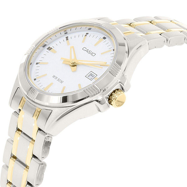 ساعت مچی زنانه کاسیو مدل CASIO LTP-1308SG-7AVDF با ترکیب رنگ طلایی و نقره‌ای طراحی شده است. این مدل دارای مقاومت در برابر آب تا ۵۰ متر، بند استیل ضد زنگ، و طراحی ساده و کاربرپسند برای استفاده روزمره است. طراحی شیک آن مناسب برای استایل‌های رسمی و غیررسمی می‌باشد.