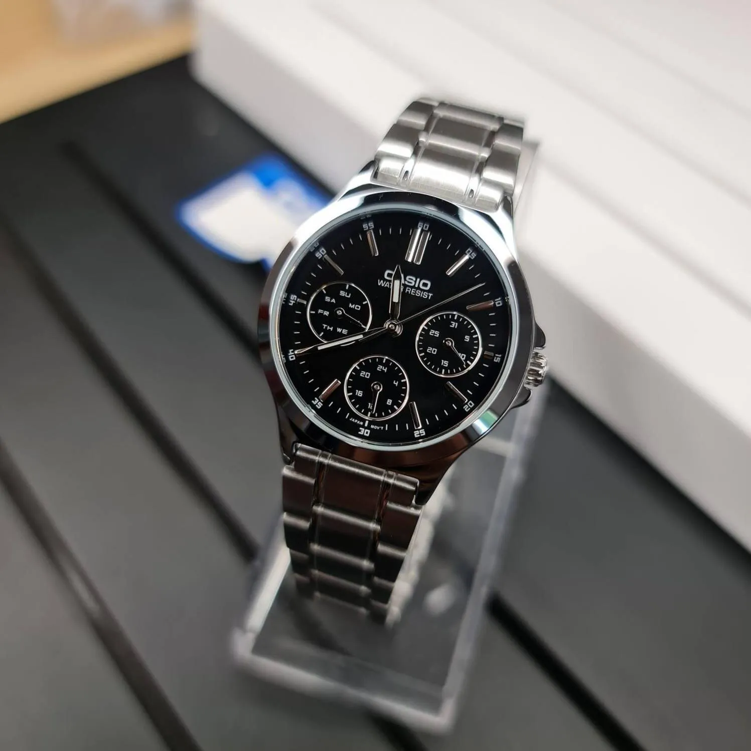 ساعت مچی زنانه کاسیو مدل CASIO LTP-V300D-1A این ساعت زنانه با طراحی کلاسیک و بند استیل ضد زنگ، دارای صفحه مشکی با اعداد برجسته و نشانگرهای ساعتی است. مقاوم در برابر آب و نمایش تاریخ، روز و ساعت 24 ساعته را ارائه میدهد. طراحی ساده و شیک آن مناسب برای استفاده روزمره و هر مناسبتی است.
