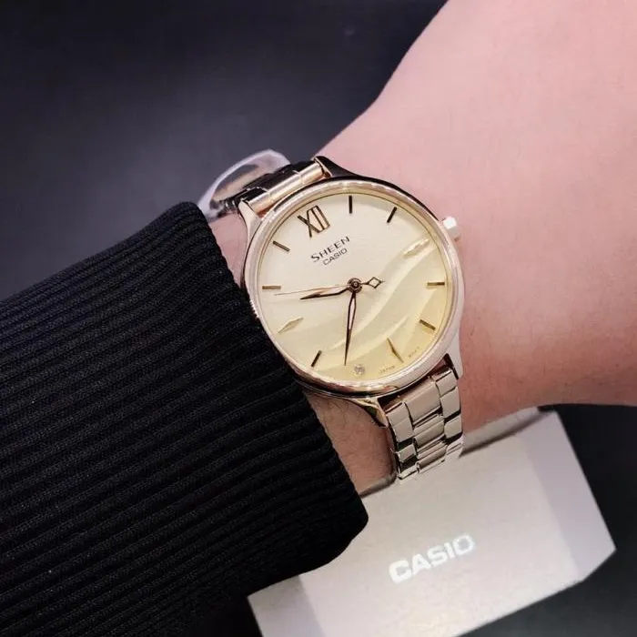 مدل SHE-4550G-9AUDF با طراحی الهامگرفته از امواج دریا و رنگهای ساحل در نور صبحگاهی، جلوهای زنانه و درخشان روی مچ ایجاد میکند. صفحه با افکت موج و گرادیان رنگی طلایی حس عمق و بعد به طراحی ساعت میدهد و کریستال تزئینی در موقعیت ساعت ۷ زیبایی آن را تکمیل میکند.