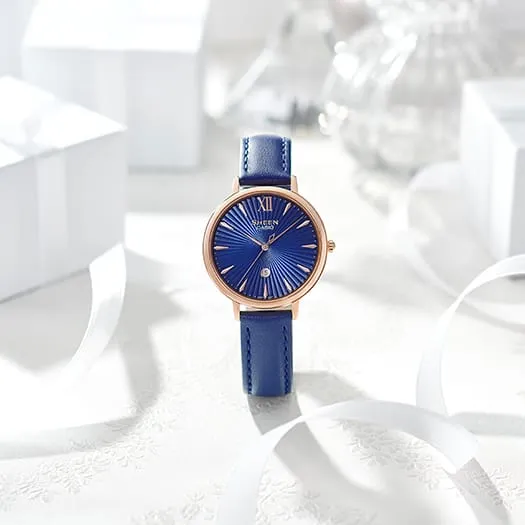 این مدل ترکیبی از طراحی مینیمال و ظرافت کلاسیکه. قاب رزگلد در کنار صفحه آبی تیره و بند چرمی سورمهای جلوهای خاص و زنانه ایجاد کرده که هم برای استایل رسمی و هم روزمره عالیه.