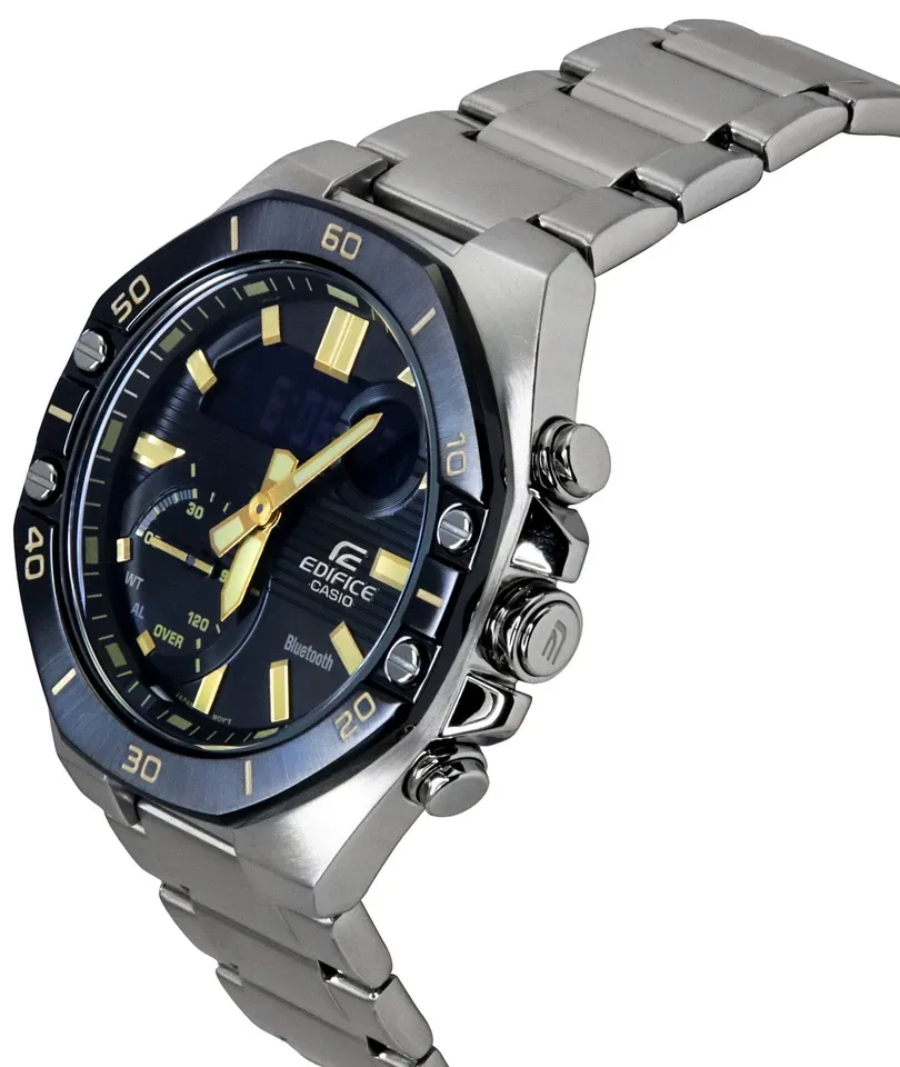 ساعت مچی کاسیو ادیفایس مدل ECB-10DB-1A9ADF از سری هوشمند و مدرن EDIFICE است؛ ترکیبی از طراحی اسپرت، فناوری بلوتوث و دقت مهندسی ژاپنی. این مدل با قاب هشت‌ضلعی خاص و جزئیات طلایی روی صفحه مشکی، ظاهری حرفه‌ای و جسورانه دارد که برای علاقه‌مندان به استایل اسپرت-لوکس کاملاً مناسب است.