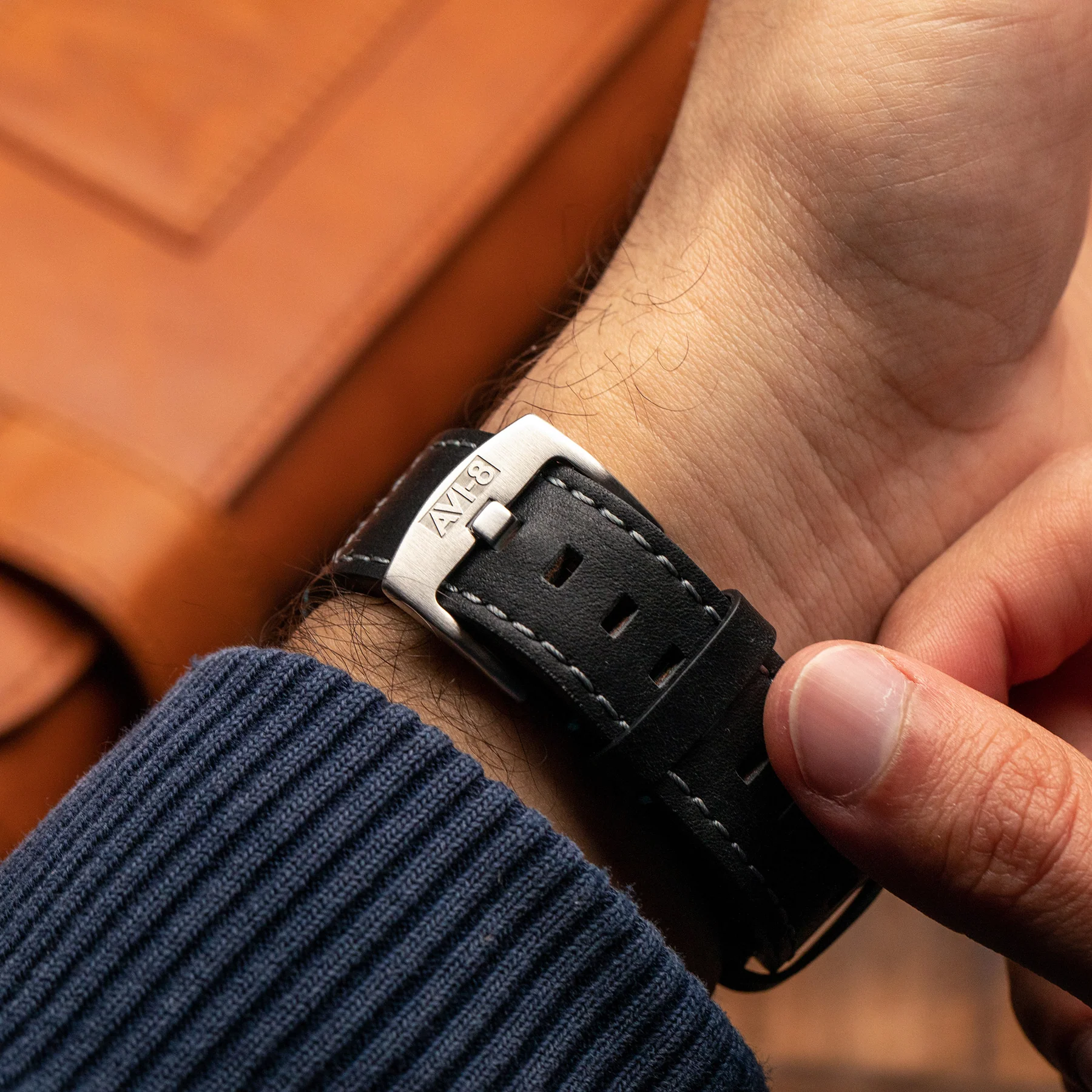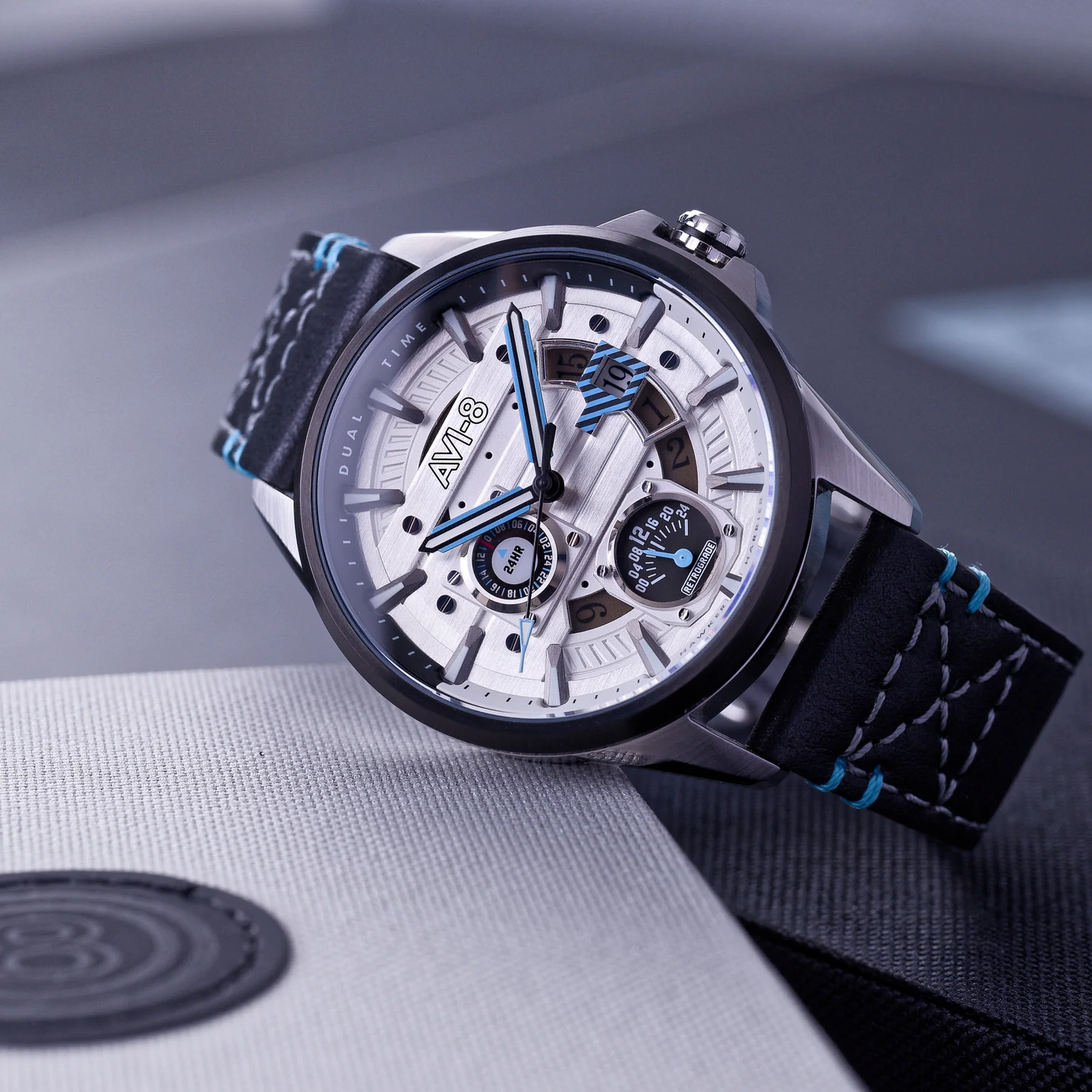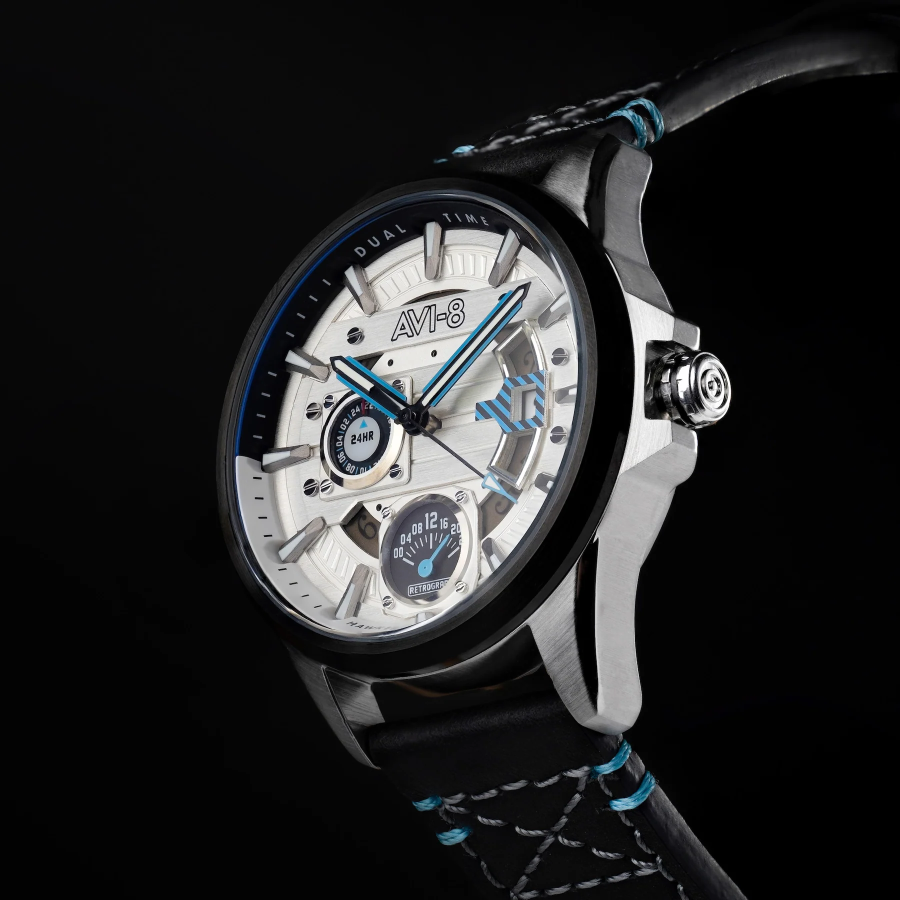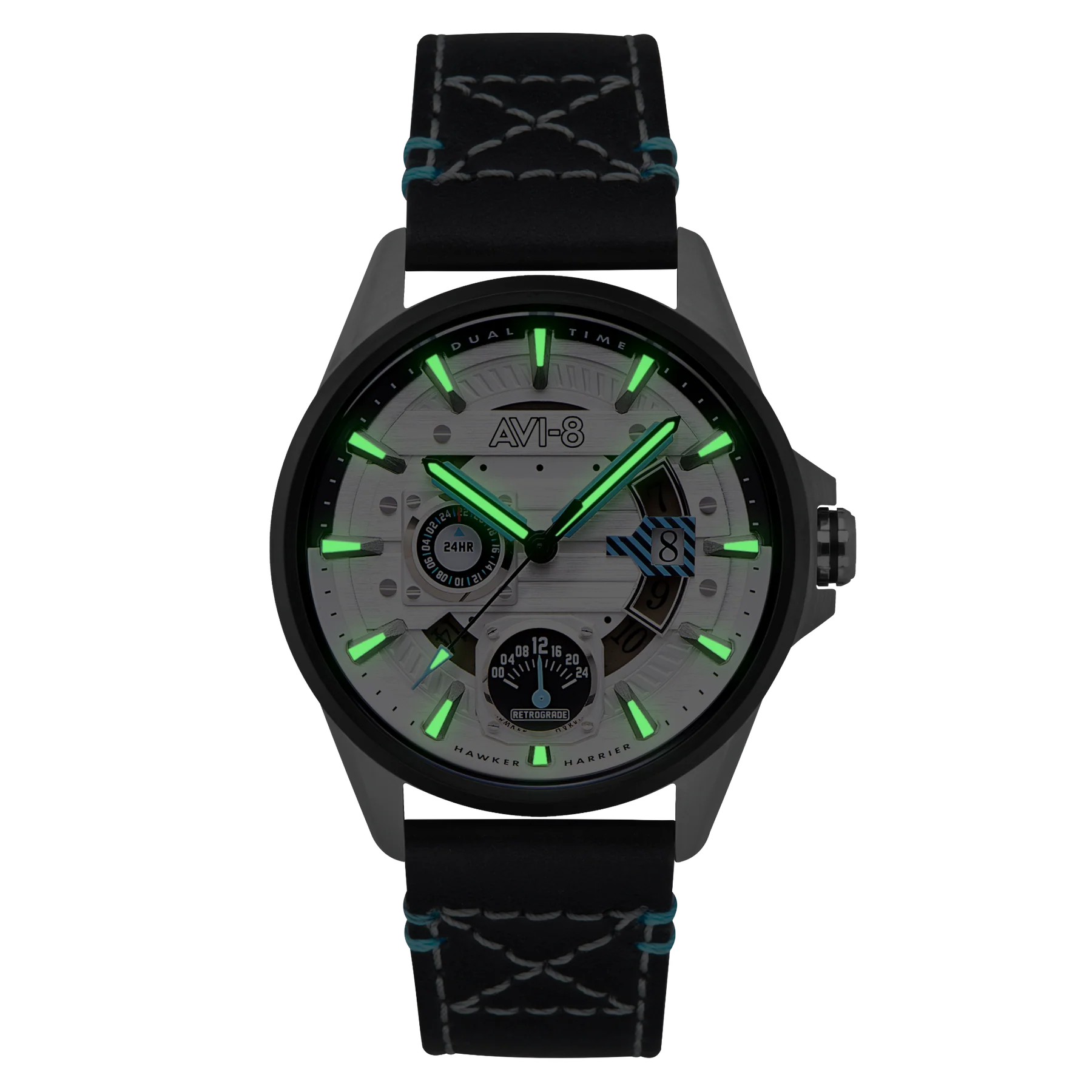 ساعت مچی مردانه ای وی ایت AVI-8 مدل AV-4098-01 این ساعت که به نام خلبان آزمایشی مشهور هاکر هاریير، جان فارلی، نامگذاری شده است، طراحی داخلی کابین خلبان هواپیمای نمادین "Jump Jet" را با نمایشگر دو زمانه، تاریخ و خوانش ۲۴ ساعته به تصویر میکشد. تمامی این ویژگیها در یک قاب محکم و مقاوم از استیل ضدزنگ درجه دریایی جای گرفتهاند که به راحتی قابل استفاده است.