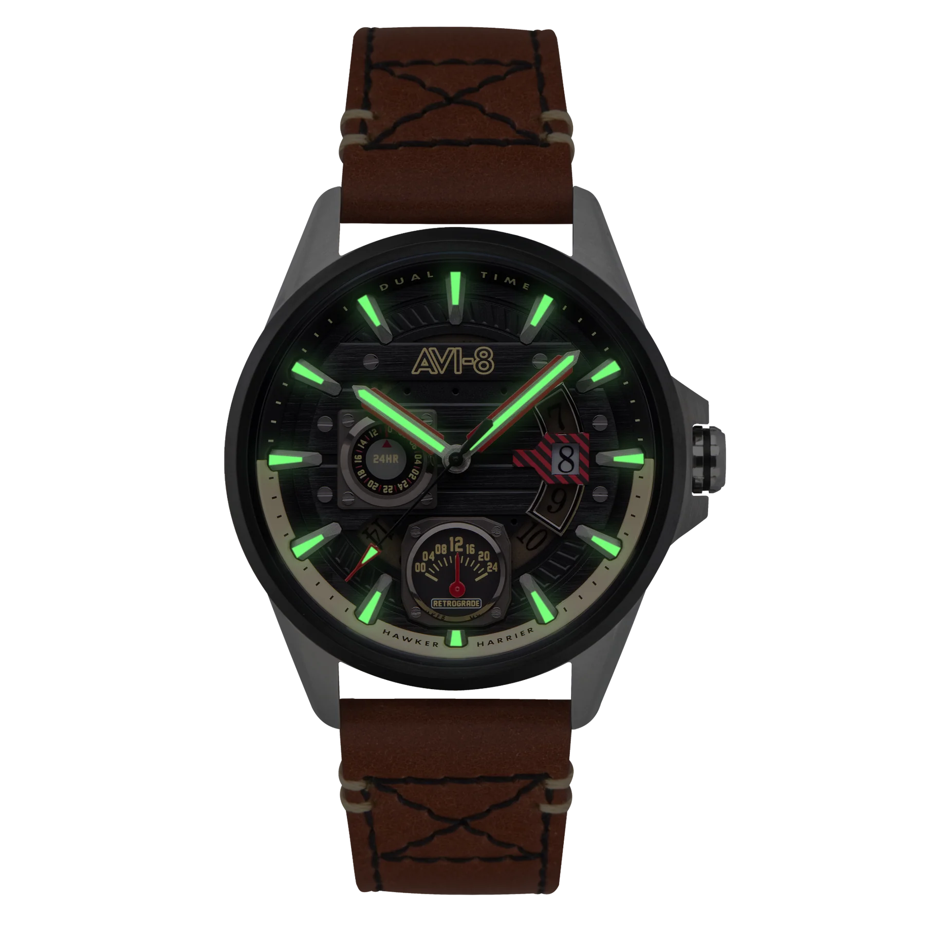 ساعت مچی مردانه ای وی ایت AVI-8 مدل AV-4098-02 این ساعت که به نام خلبان آزمایشی مشهور هاکر هاریير، جان فارلی، نام‌گذاری شده است، طراحی داخلی کابین خلبان هواپیمای نمادین "Jump Jet" را با نمایشگر دو زمانه، تاریخ و خوانش ۲۴ ساعته به تصویر می‌کشد. تمامی این ویژگی‌ها در یک قاب محکم و مقاوم از استیل ضدزنگ درجه دریایی جای گرفته‌اند که به راحتی قابل استفاده است.