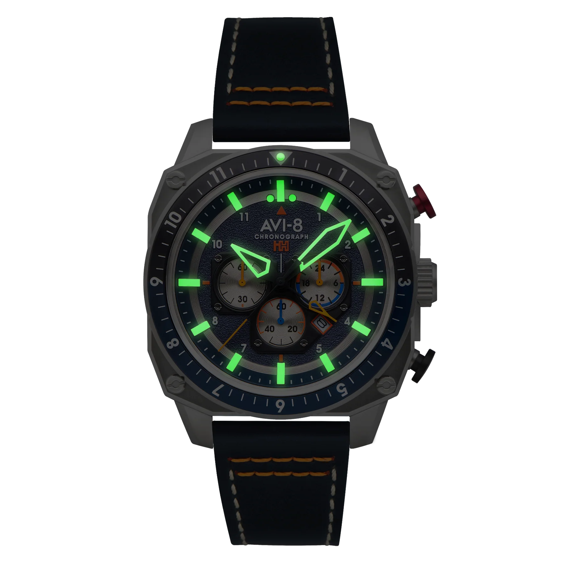 ساعت مچی مردانه ای وی ایت AVI-8 مدل AV-4100-02 مجهز به مکانیزم داخلی یک حرکت کرونوگراف ژاپنی با خوانش زمان تقسیمشده، ساعت کرونوگراف دو زمانه هاکر هانتر آتلان، امکان نمایش چندین منطقه زمانی را برای کاربر فراهم میکند. این ساعت ترکیبی از روح هواپیمای پیشگام دوران جت و ساختار مهندسی و عملکرد آن است.