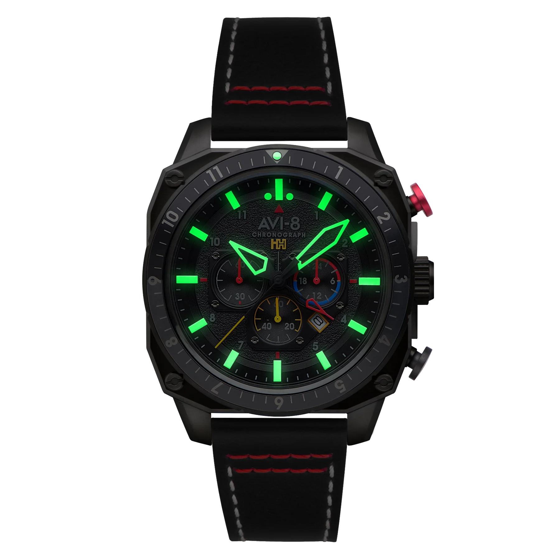 ساعت مچی مردانه ای وی ایت AVI-8 مدل AV-4100-04 مجهز به مکانیزم داخلی یک حرکت کرونوگراف ژاپنی با خوانش زمان تقسیمشده، ساعت کرونوگراف دو زمانه هاکر هانتر آتلان، امکان نمایش چندین منطقه زمانی را برای کاربر فراهم میکند. این ساعت ترکیبی از روح هواپیمای پیشگام دوران جت و ساختار مهندسی و عملکرد آن است.