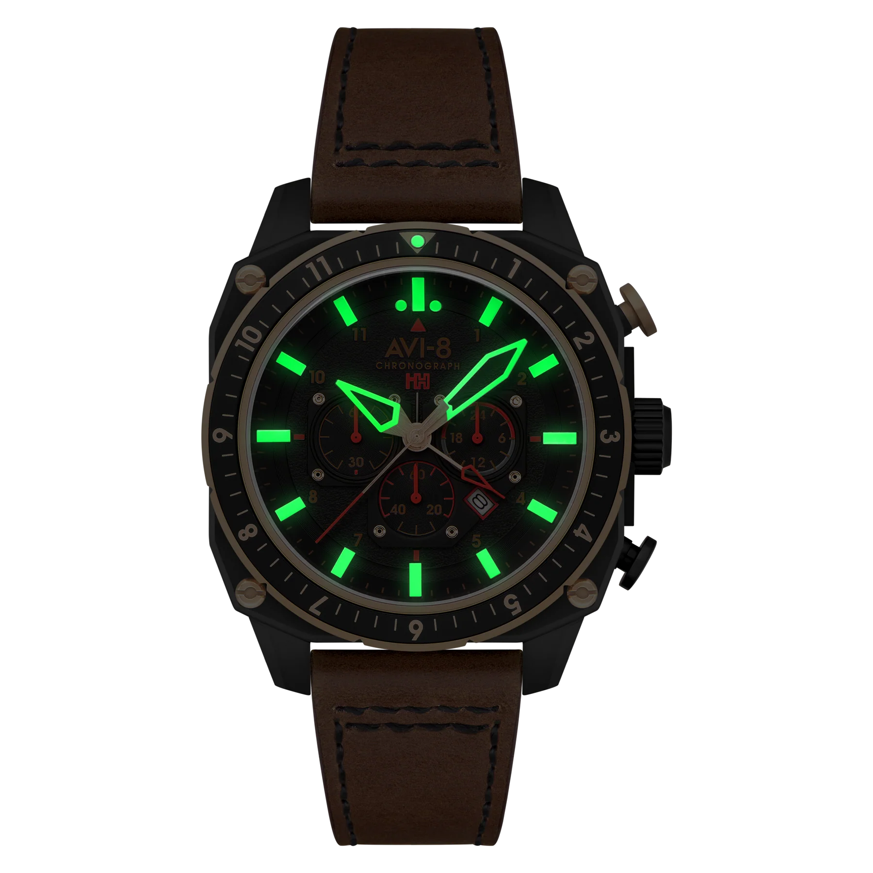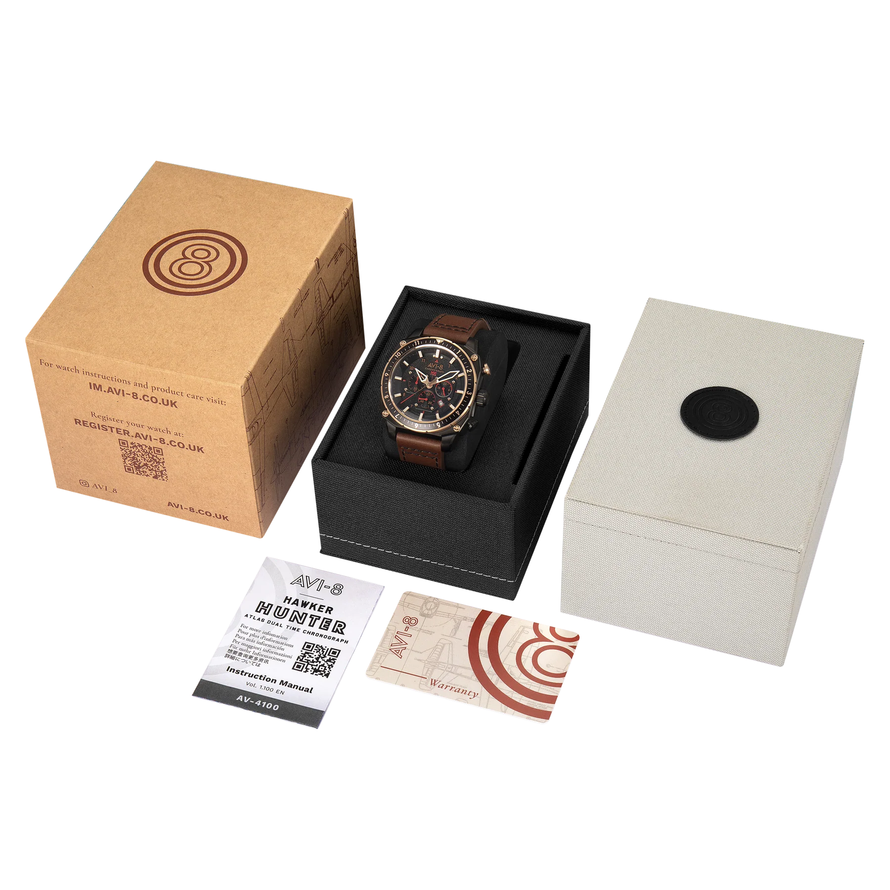 ساعت مچی مردانه ای وی ایت AVI-8 مدل AV-4100-09 مجهز به مکانیزم داخلی یک حرکت کرونوگراف ژاپنی با خوانش زمان تقسیمشده، ساعت کرونوگراف دو زمانه هاکر هانتر آتلان، امکان نمایش چندین منطقه زمانی را برای کاربر فراهم میکند. این ساعت ترکیبی از روح هواپیمای پیشگام دوران جت و ساختار مهندسی و عملکرد آن است.