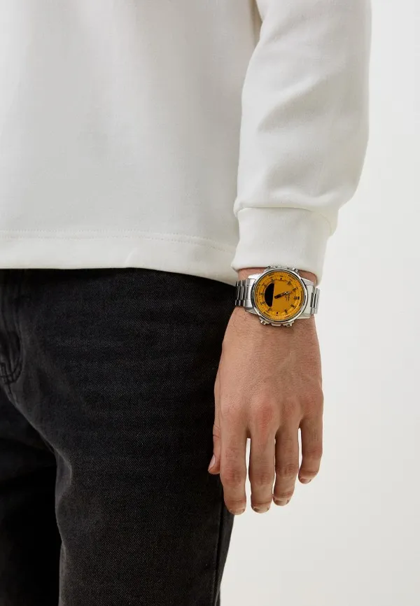 صفحه زرد باعث می‌شود این ساعت در استایل اسپرت و کژوال بسیار چشم‌گیر باشد و تضاد رنگی جذابی با بند فلزی نقره‌ای ایجاد کند، در حالی که نمایش دیجیتال با پس‌زمینه تاریک، خوانایی عملکردهای مختلف را افزایش می‌دهد.