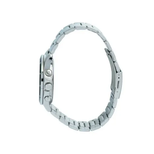 قاب و بند: قاب و بند ساعت از جنس استیل ضد زنگ ساخته شده است که دوام بالا و ظاهری لوکس به ساعت میبخشد. رنگ فلز نقرهای مات، جلوهای اسپرت و در عین حال رسمی ایجاد کرده و با انواع استایلها هماهنگی دارد.