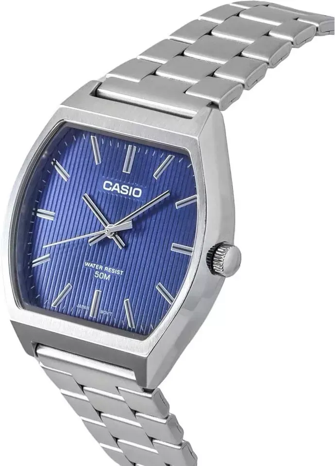 MTP-B140D-2AVDF با طراحی مربعی، شاخصهای طلایی و صفحه سرمهای، ترکیبی از ظرافت و جسارت را ارائه میدهد. مقاومت در برابر آب، بند استیل مقاوم و طراحی مدرن باعث میشود این ساعت گزینهای مطمئن و کاربردی برای کسانی باشد که به دنبال استایل کلاسیک همراه با ویژگیهای امروزی هستند.