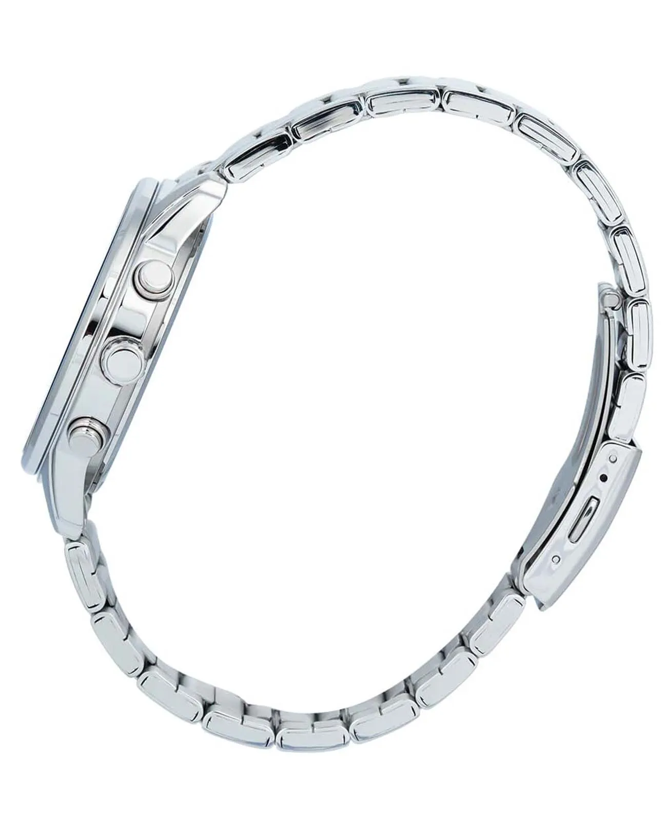 بند استیل با طراحی ارگونومیک، راحتی کامل روی مچ دست ایجاد میکند. رنگبندی کلاسیک نقرهای و صفحه مشکی باعث شده این ساعت با انواع استایلها هماهنگ شود، چه کتوشلوار رسمی، چه لباس روزمره یا نیمهرسمی.