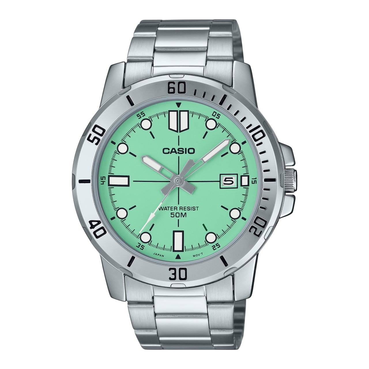 یکی از ویژگیهای بارز ساعت MTP-VD01D-3E1VUDF، صفحه سبز ملایم آن است که با قاب فلزی نقرهای ترکیب شده و نمایی شیک و جذاب ایجاد میکند. این رنگ جذاب و آرامشبخش، امکان ست کردن ساعت با لباسهای روزمره و رسمی را به راحتی فراهم میکند. قاب فلزی ساعت نه تنها استحکام بالایی دارد، بلکه به دلیل طراحی کلاسیک و مینیمال، جلوهای لوکس و باکیفیت به ساعت میبخشد. عقربهها و شاخصهای ساعت به گونهای طراحی شدهاند که خوانایی بالا در تمامی شرایط نوری را تضمین کنند و صفحه سبز ملایم ساعت جلوهای متفاوت و جذاب به ظاهر آن اضافه کرده است.