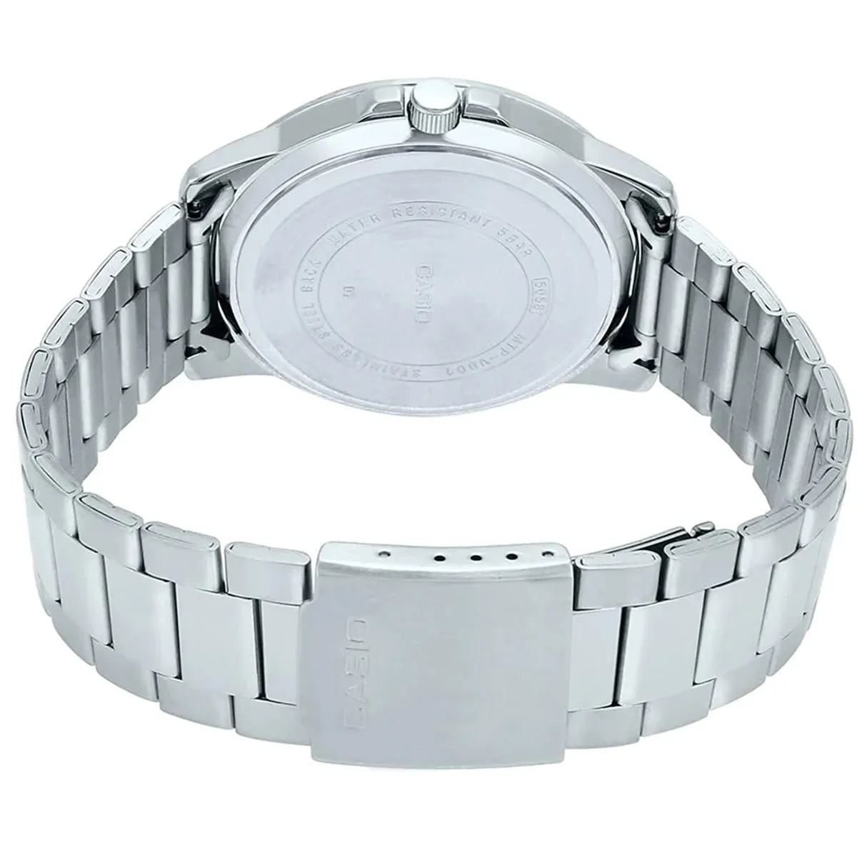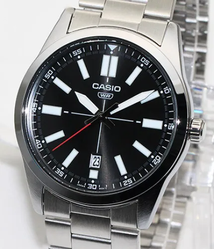 ساعت کاسیو MTP‑VD02D‑1EUDF دارای قاب و بند فلزی نقرهای است که جلوهای شیک و لوکس ایجاد میکند. صفحه ساعت مشکی طراحی شده و با عقربهها و نشانگرهای متضاد، خوانایی بالایی دارد. نمایش تاریخ در موقعیت ۶ ساعت، علاوه بر کاربردی بودن، زیبایی و تقارن صفحه را بیشتر میکند.