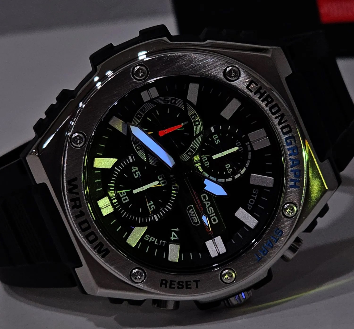 طراحی صفحه این ساعت یکی از نقاط قوت آن است. استفاده از اندکسهای برجسته، نمایشگرهای چندلایه، بافت ریز خورشیدی روی صفحه و نشانهگذاری واضح باعث شده حتی در نور کم نیز خوانایی عالی داشته باشد. همین سبک طراحی یادآور ساعتهای کرونوگراف حرفهای است و حس قدرت و عملکرد را منتقل میکند؛ حتی اگر عملکرد کرونوگراف دیجیتال نداشته باشد، ظاهر آن حس یک ساعت چندمنظوره کامل را به شما میدهد.