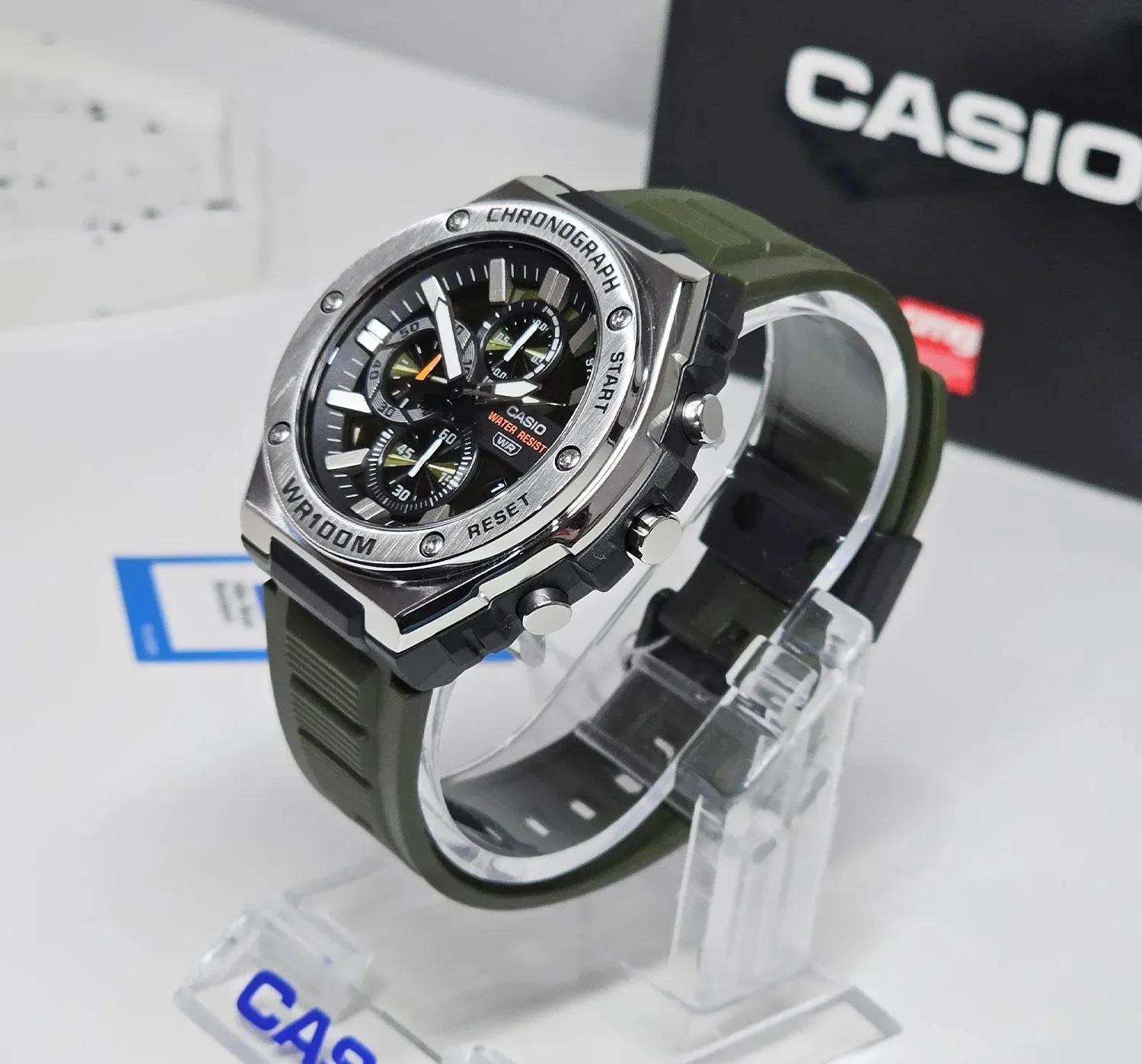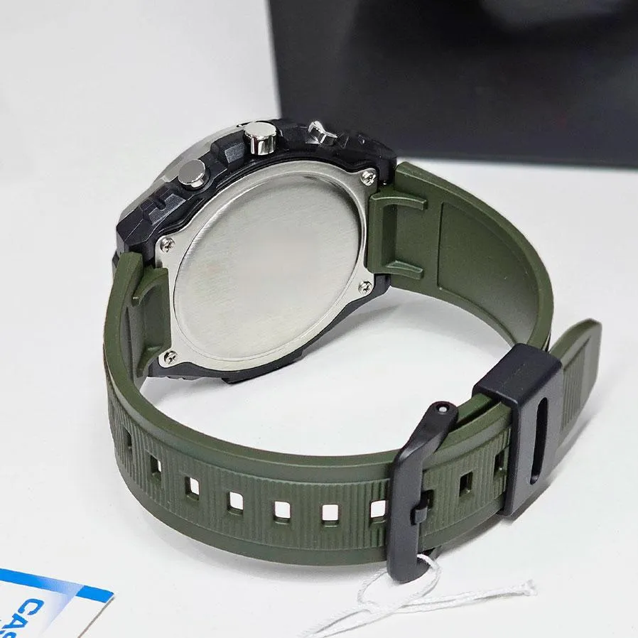 یکی از ویژگیهای خاص این مدل، رنگ سبز ارتشی قاب و بند است که جلوهای مردانه، مدرن و متفاوت ایجاد میکند. این ترکیب رنگ باعث شده MWA-300H-3A نسبت به مدلهای مشکی یا نقرهای مشابه، شخصیتی منحصربهفرد و چشمگیر داشته باشد. قاب بزرگ و زاویهدار ساعت در کنار حلقه فلزی با پرداخت hairline و Mirror ظاهری لوکس اما اسپرت به آن داده است؛ یعنی هم میتوانید برای استایل روزمره از آن استفاده کنید و هم برای فعالیتهای ورزشی یا فضای باز.