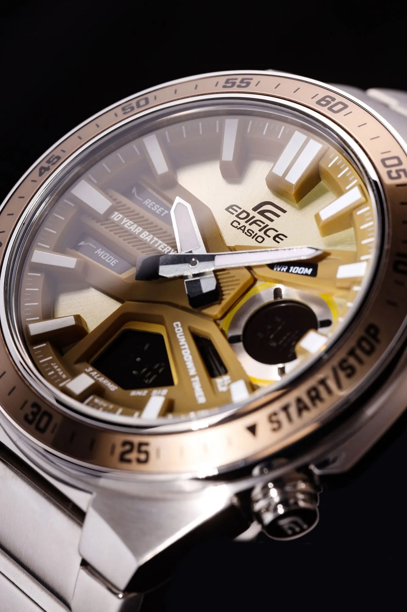 ساعت EFV-C110D-5ADF ترکیبی از ظاهر کلاسیک آنالوگ و کاربرد دیجیتال است. صفحه ساعت با عمقبخشی و طراحی سهبعدی، جلوهای پویا و اسپرت ایجاد میکند و نگاه هر بینندهای را به خود جلب میکند. زیر صفحه دیجیتال، نمایشگرهای کوچک قرار دارند که امکانات کاربردی مانند زمان جهانی، کرنومتر با دقت یک صدم ثانیه و تایمر شمارش معکوس را به کاربران ارائه میدهند.