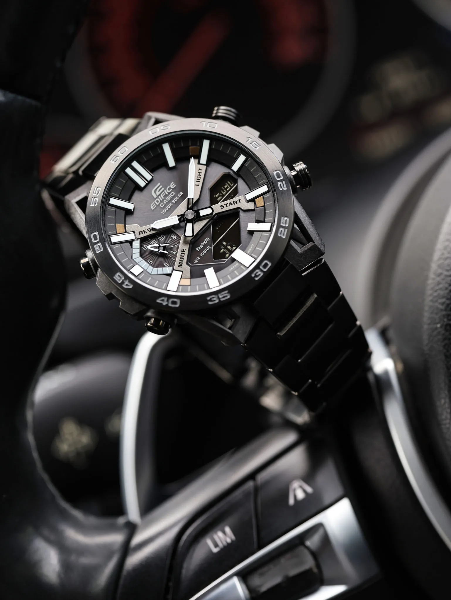طراحی صفحه آنالوگ‌-دیجیتال با جزئیات دقیق، حالتی فنی و اسپرت دارد و ترکیب رنگ تیره با نمایشگر دیجیتال ظریف، ظاهری حرفه‌ای و جسورانه به آن داده است. این مدل دقیقاً همان حس هیجان و نظم مهندسی را دارد که از برند EDIFICE انتظار می‌رود.