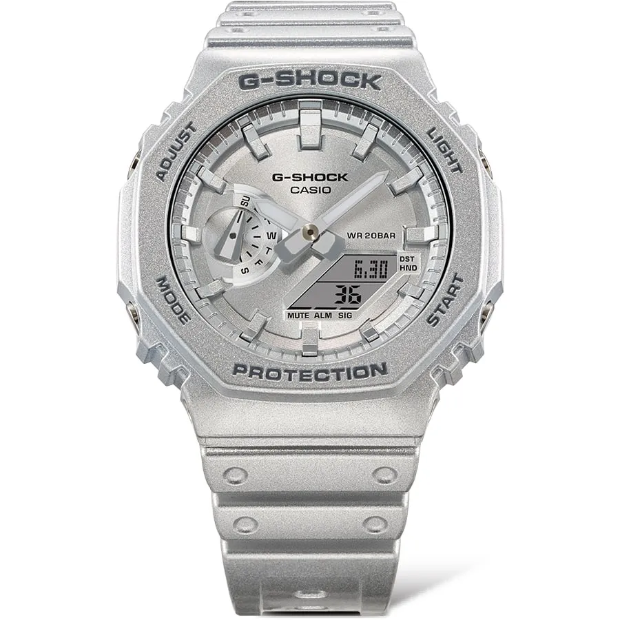 با G-SHOCK نقرهای متالیک به گذشتهای با نگاه به آینده بازگردید. ساعت مچی اسپرت جی شاک کاسیو مدل G-SHOCK GA-2100FF-8ADR با طراحی بزرگ نمادین خود، و طراحی هشتضلعی GA-2100، تصوری خلاقانه از آینده را ارائه میدهد. این ساعت با الهام از چشماندازهای علمی-تخیلی گذشته و درخشش نقرهای متالیک، جلوهای مدرن و بهروز پیدا کرده.