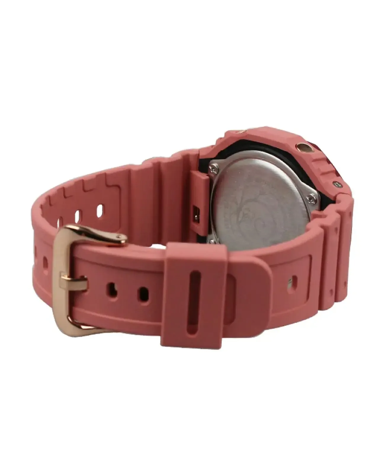صفحه نمایش دیجیتال به رنگ تیره طراحی شده تا کنتراست لازم با زمینه صورتی ایجاد شود و اعداد و اطلاعات بهوضوح خوانده شوند. این تضاد رنگی کمک میکند اطلاعات زمانی بهسادگی در دید قرار بگیرند و در عین حال ظاهر ساعت همچنان نرم و هماهنگ باقی بماند.