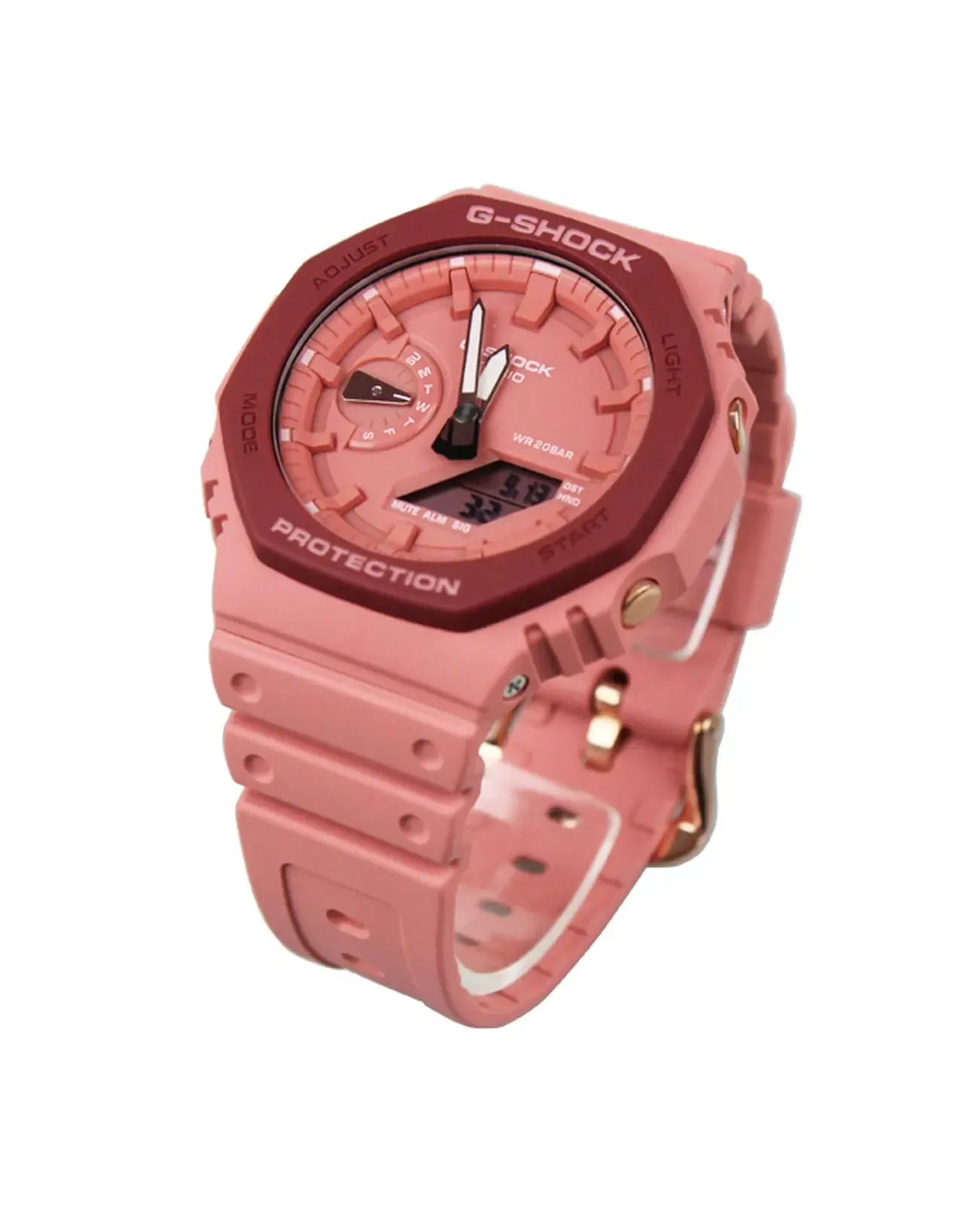 در طراحی GA-2110SL-4A4DR، تمرکز اصلی روی رنگبندی جذاب و زنانه است. بدنۀ اصلی و ساختار اجرایی این مدل از رزین مقاوم ساخته شده و ماندگاری جیشاک را حفظ میکند، اما رنگبندی آن بهگونهای انتخاب شده که در همان نگاه اول حس لطافت و شیکپوشی را منتقل کند.