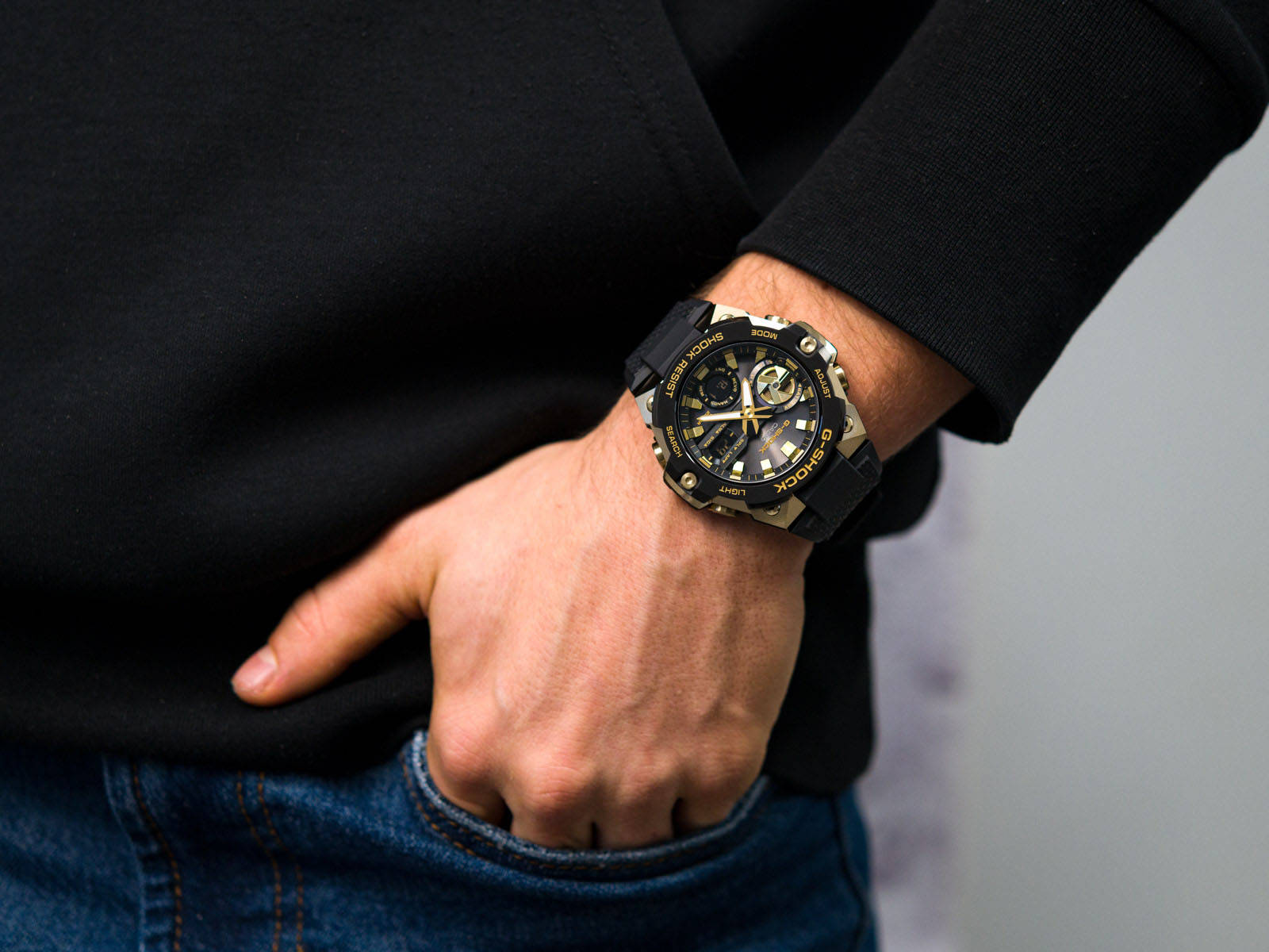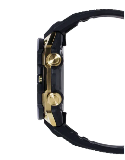 رنگ صفحه ساعت مشکی است و جزئیات، نشانگرها و عقربهها با رنگ طلایی و سفید طراحی شدهاند تا هم خوانایی عالی داشته باشند و هم هماهنگی کامل با بزل طلایی ایجاد کنند. بند ساعت از رزین مشکی مقاوم ساخته شده که علاوه بر دوام بسیار بالا، راحتی فوقالعادهای در استفاده طولانیمدت فراهم میکند. این ترکیب رنگ مشکی و طلایی باعث شده GST-B400GB-1A9DR همزمان یک ساعت اسپرت، رسمی و لاکچری باشد و بهراحتی با استایلهای مختلف ست شود.