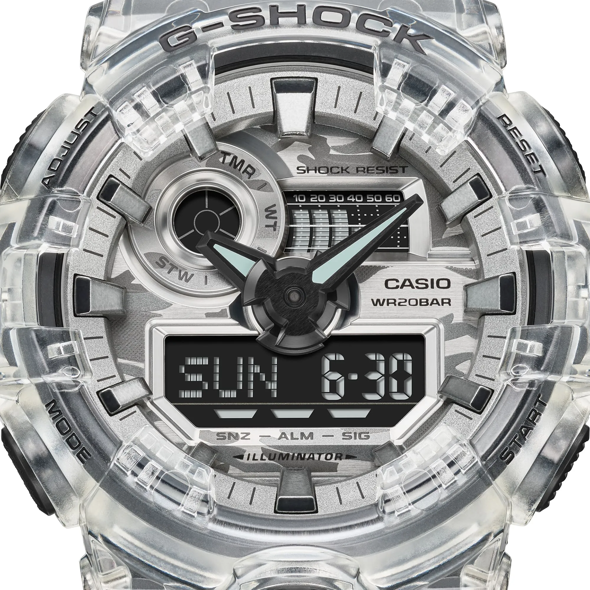 با این مدل G-SHOCK که صفحه طرح ارتشی و قاب نیمهشفاف داره، خیلی راحت میتونی تو هر موقعیتی خاص باشی.