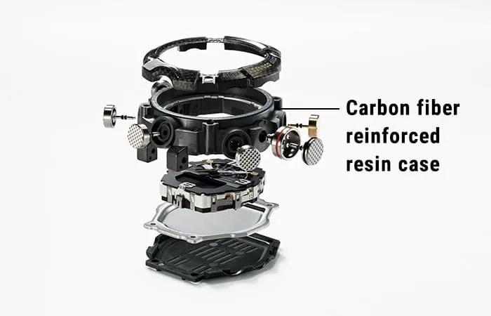قاب سهلایهی این ساعت از رزین با الیاف کربن ساخته شده و طراحی آن شبیه به یک ظرف بنزین قابل حمل در خودروهای آفرود است.