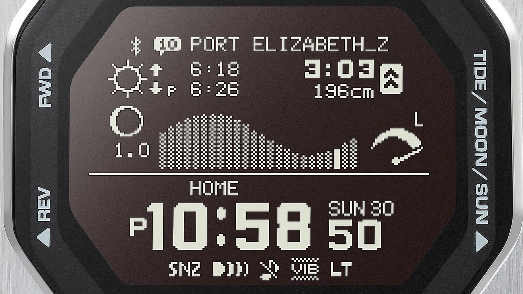 • اتصال به گوشی هوشمند از طریق بلوتوث: امکان انتخاب و ارسال اطلاعات جزر و مد و شرایط نور روز برای بیش از ۳۳۰۰ محل موج‌سواری در سراسر جهان.