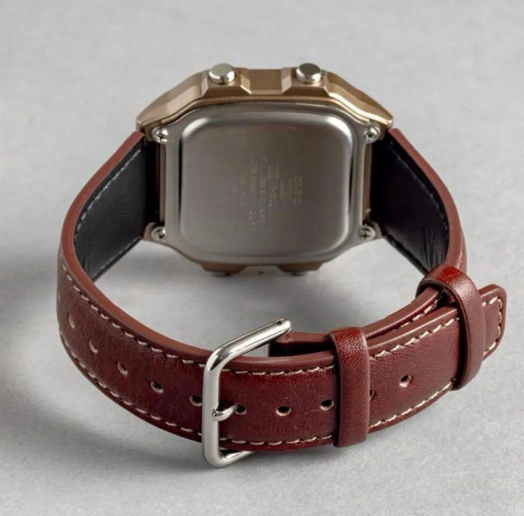 بند چرمی قهوهای و قاب رزینی قهوهای ساعت، راحتی و ثبات کامل را روی مچ فراهم میکند. صفحه دیجیتال تیره با اعداد واضح خوانایی بالایی دارد و نور LED آن امکان مشاهده اطلاعات حتی در شب را فراهم میکند. طراحی کلاسیک و رنگبندی هماهنگ، سادگی و شیک بودن ساعت را دوچندان کرده است.