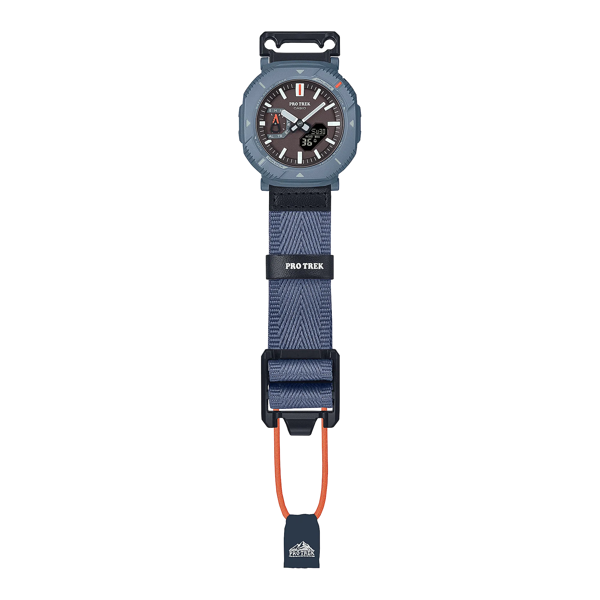 ساعت PRJ-B001B-2 با صفحه آبی خاکستری (Dusty Blue) و جزئیات فلورسانس در اعداد و قاب، ظاهری جذاب و هماهنگ با طبیعت دارد. بند بونجی/پارچهای باعث راحتی، تنفس بهتر و انعطافپذیری بالاتر میشود و میتوانید ساعت را روی لباسهای ضخیم یا مستقیماً روی مچ دست ببندید.